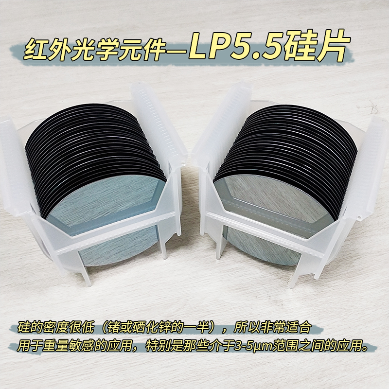 硅具有低成本、低密度的優(yōu)勢,同時光譜介于1.2-7μm區(qū)域,是作為NIR廣泛使用的材料,硅的密度很低2.33g/cm3,只有鍺或硒化鋅的一半,努氏硬度為1150,常用于比較重量敏感的應(yīng)用,特別是光譜介于3-5μm范圍內(nèi)的應(yīng)用,