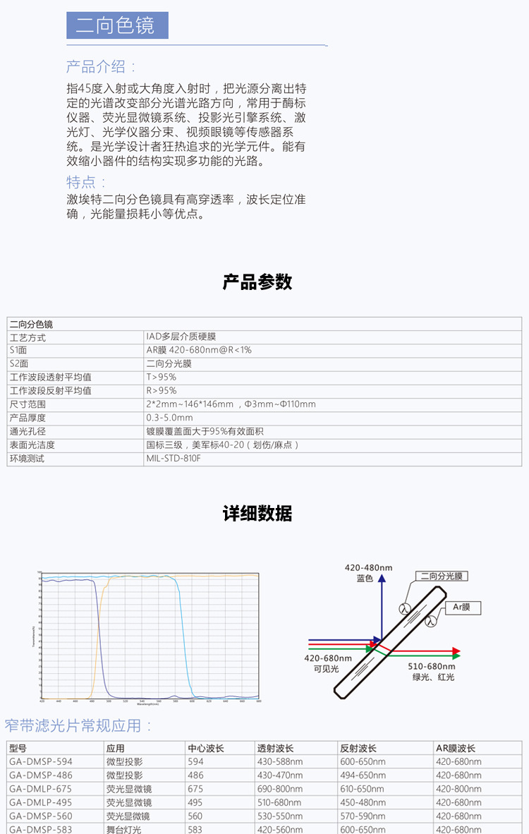 膜層穩(wěn)定,極小的膜層飄移,抗激光破壞性高;廣泛用于舞臺(tái)激光燈、投影、光學(xué)儀器等光學(xué)系統(tǒng)中。